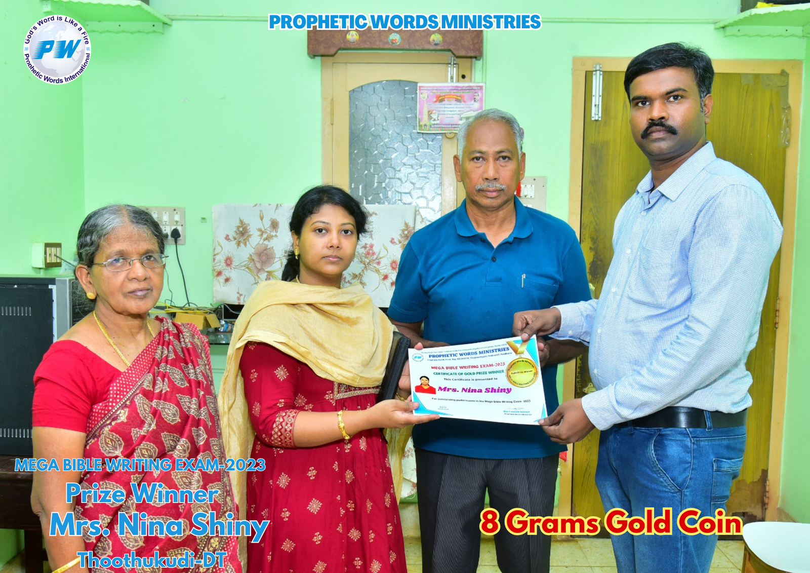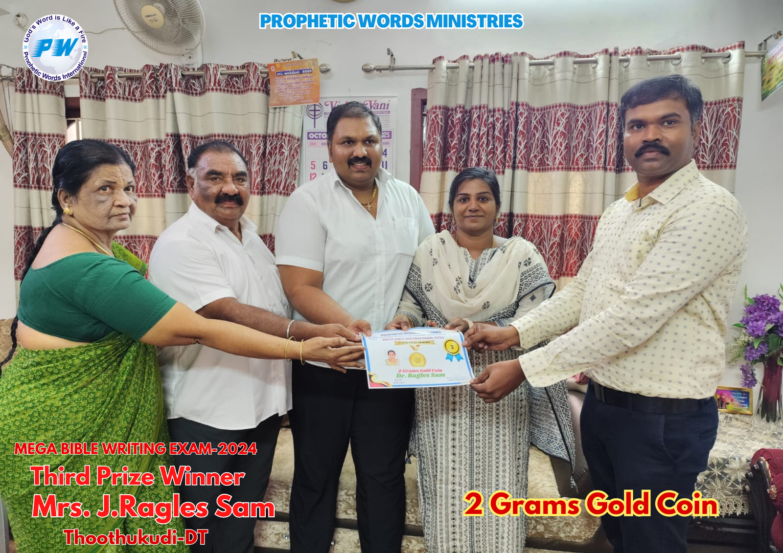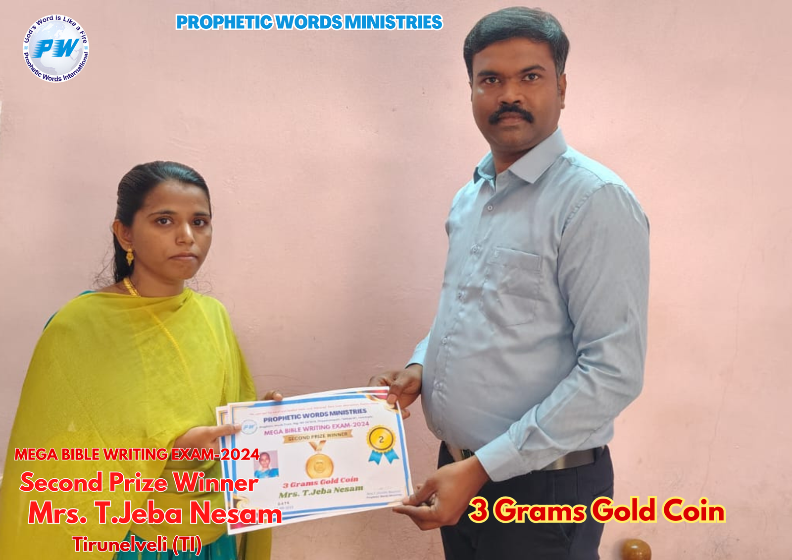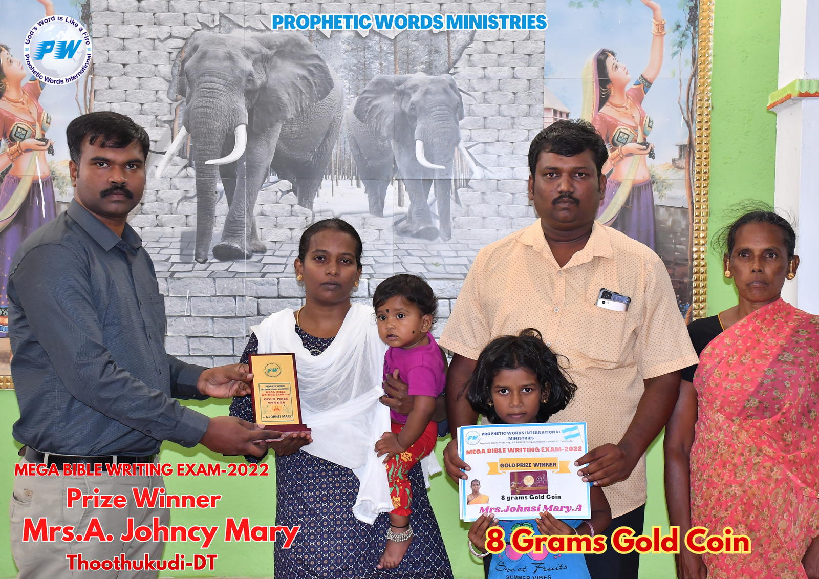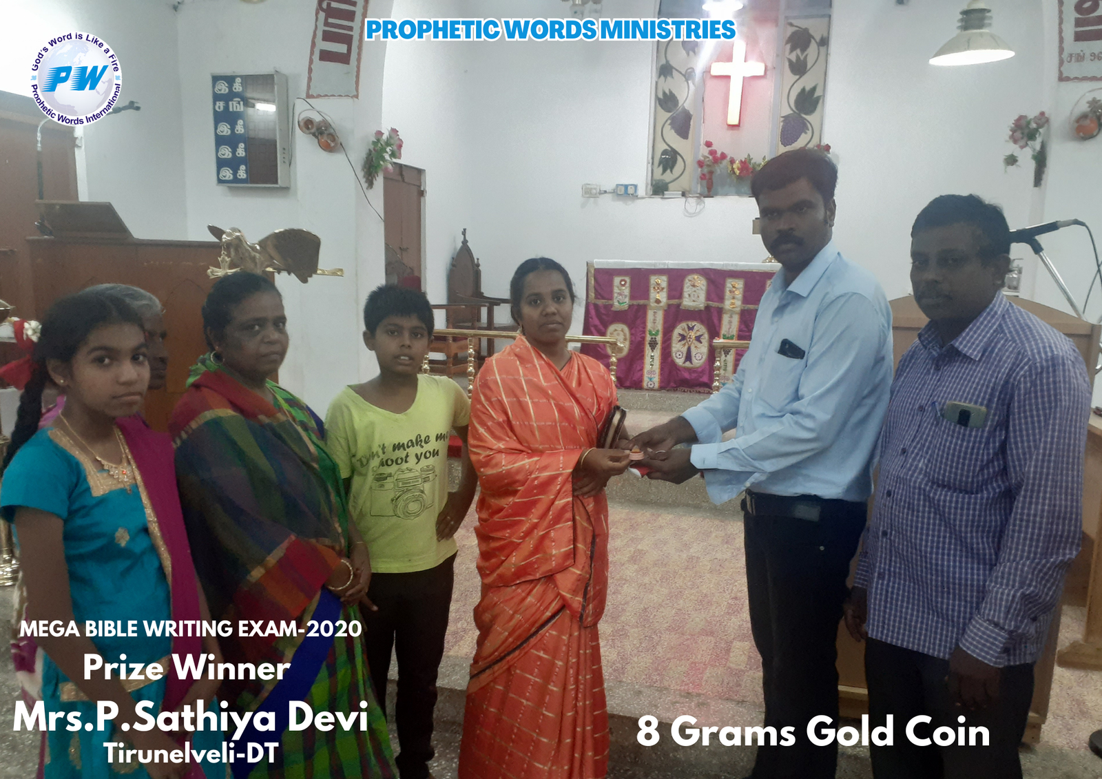 அதன்படி இறுதி சுற்றுக்கு தேர்ந்தெடுக்கப்பட்ட 18 பேரிலிருந்து திருநெல்வேலி மாவட்டத்தினை சேர்ந்த Mrs.P.Sathiya Devi (RvA286 Qz1002 ) என்ற சகோதரி தேர்ந்தெடுக்கப்பட்டார்கள். அவருக்கு அறிவித்தபடி ஒரு சவரன் தங்கம் பரிசாக வழங்கப்பட்டது. தேர்வினை எழுதிய மற்றவர்களை மல்கியா 3:10 இன் படி பரலோக தேவன்தாமே வானத்தின் பல கணிகளை திறந்து ஆசீர்வதித்தார். அநேகர் தேவன் கொடுத்த ஆசீர்வாதத்தினை பெற்றுக் கொண்டார்கள்.