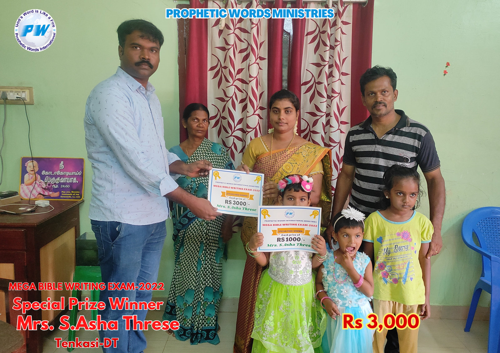 கர்த்தருடைய பரிசுத்த வேதவார்த்தையை எழுத அர்ப்பணித்த மற்றவர்களை சர்வவல்ல தேவன் ’நான் உன்னைப் பெரிய ஜாதியாக்கி, உன்னை ஆசீர்வதித்து, உன் பேரைப் பெருமைப்படுத்துவேன்; நீ ஆசீர்வாதமாய் இருப்பாய். உன்னை ஆசீர்வதிக்கிறவர்களை ஆசீர்வதிப்பேன், உன்னைச் சபிக்கிறவனைச் சபிப்பேன்; பூமியிலுள்ள வம்சங்களெல்லாம் உனக்குள் ஆசீர்வதிக்கப்படும் (ஆதியாகமம் 12:2,3)’ என்ற வேத வசனத்தின் படி உற்சாகம் கொண்டு தேர்வினை எழுதிய அனைவரையும் பரலோக தேவன் ஆசீர்வதித்தார்.