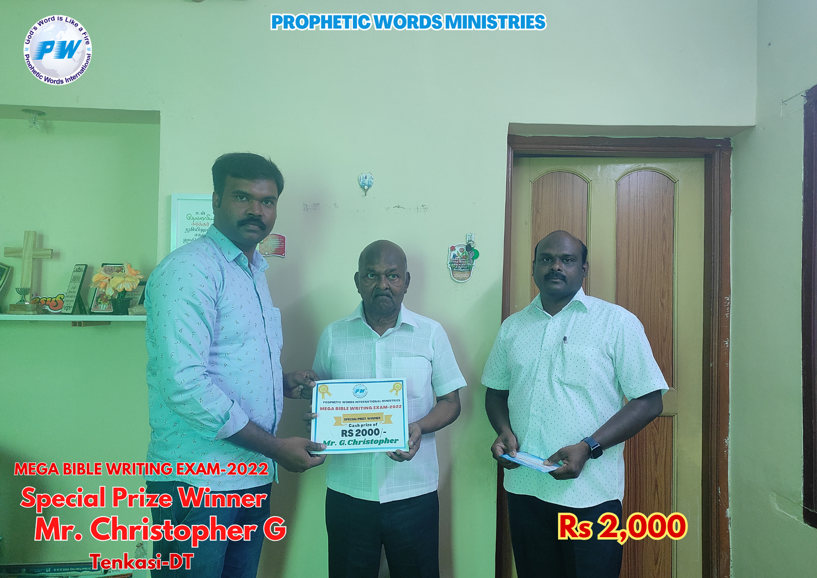 எல்லா வேதாகமம் எழுதும் தேர்விலும் தேர்ந்தெடுக்கப்பட்ட எல்லாருக்கும் பரிசுகளை வீடுகளுக்கு கொண்டு சென்று கொடுப்பதுதான் வழக்கம். இன்று வரை இதே முறைதான் பின்பற்றப்படுகின்றது. ஆனால், அதிக உறுப்பினர்கள் எழுதிய குடும்பத்திற்கான பரிசினை பெற தேர்ந்தெடுக்கப்பட்ட குடும்பத்தினர் வெளிமாநிலத்தில் இருந்தார்கள். எனவே, அவர்களுக்கு நேரில் கொண்டு கொடுக்க முடியவில்லை. G-PAY மூலமாக ரூபாய் 4,000 அனுப்பப்பட்டது. அதை அவர்கள் சந்தோஷமாக பெற்றுக் கொண்டார்கள்.