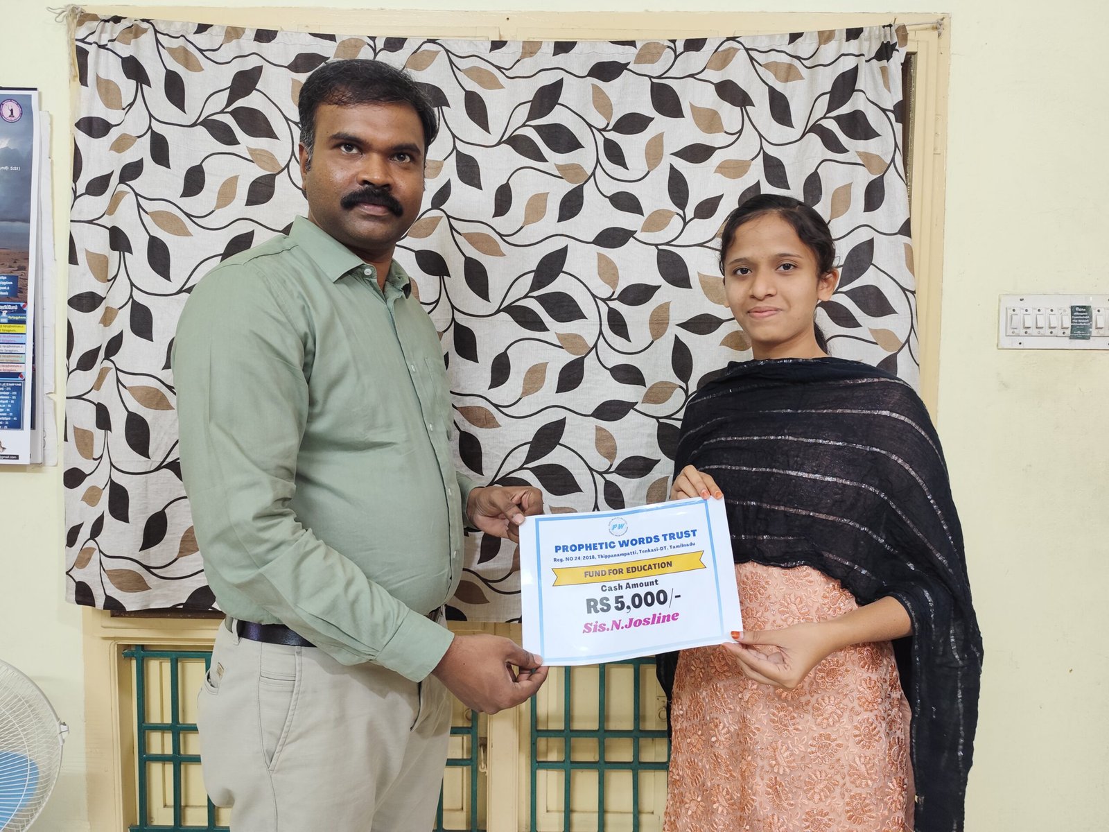அதன்படி கணவனை இழந்து மூன்று சிறு பிள்ளைகளுடன் வாழும் தென்காசி மாவட்டத்தினை சேர்ந்த சகோதரி P.கலாராணியின் மூன்று குழந்தைகளின் படிப்பு செலவுக்காக 2021-ம் வருடம் ரூபாய் 20,000 வழங்கப்பட்டது. மேலும் தென்காசி மாவட்டத்தினை சேர்ந்த சகோதரி N.Josline படிப்பு செலவுக்காக 2025-ம் வருடம் ரூபாய் 5,000 வழங்கப்பட்டது. இன்னும் பரலோக தேவனுடைய சித்தத்தின்படி தகுதியான நபர்களுக்கு உதவிகள் வழங்கப்படும்.